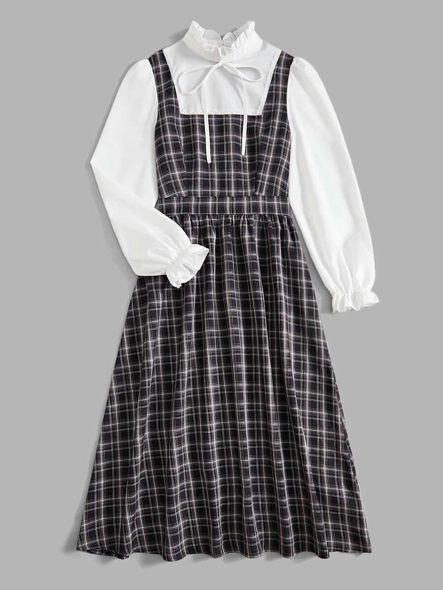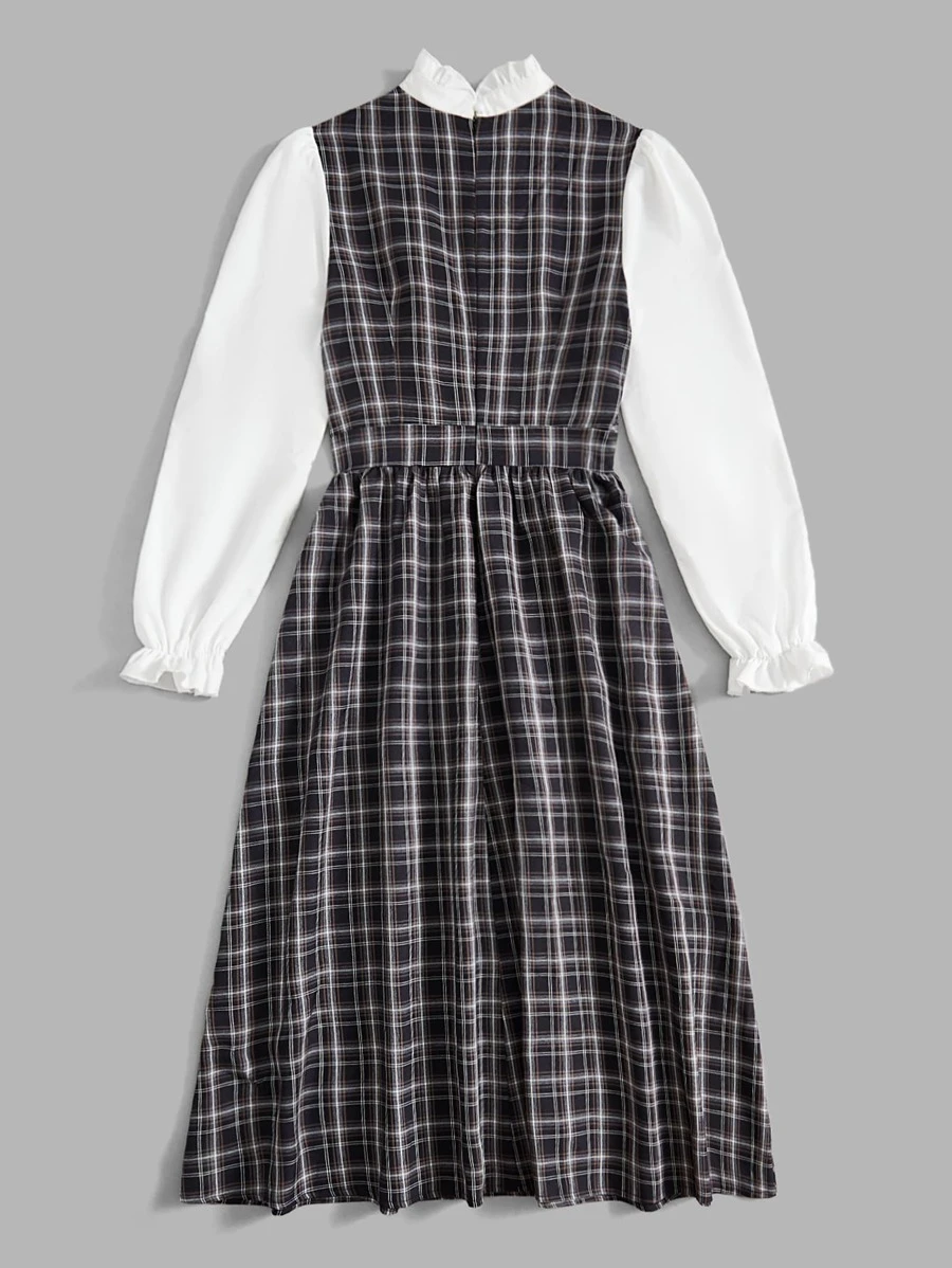 Plaid Print Tie Front Flounce Sleeve Dress