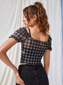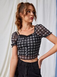 Plaid Puff Sleeve Lettuce Trim Top & Cami Top