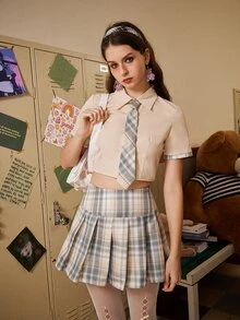 Academia Plaid Shirt & Pleated Skirt & Neck Tie
