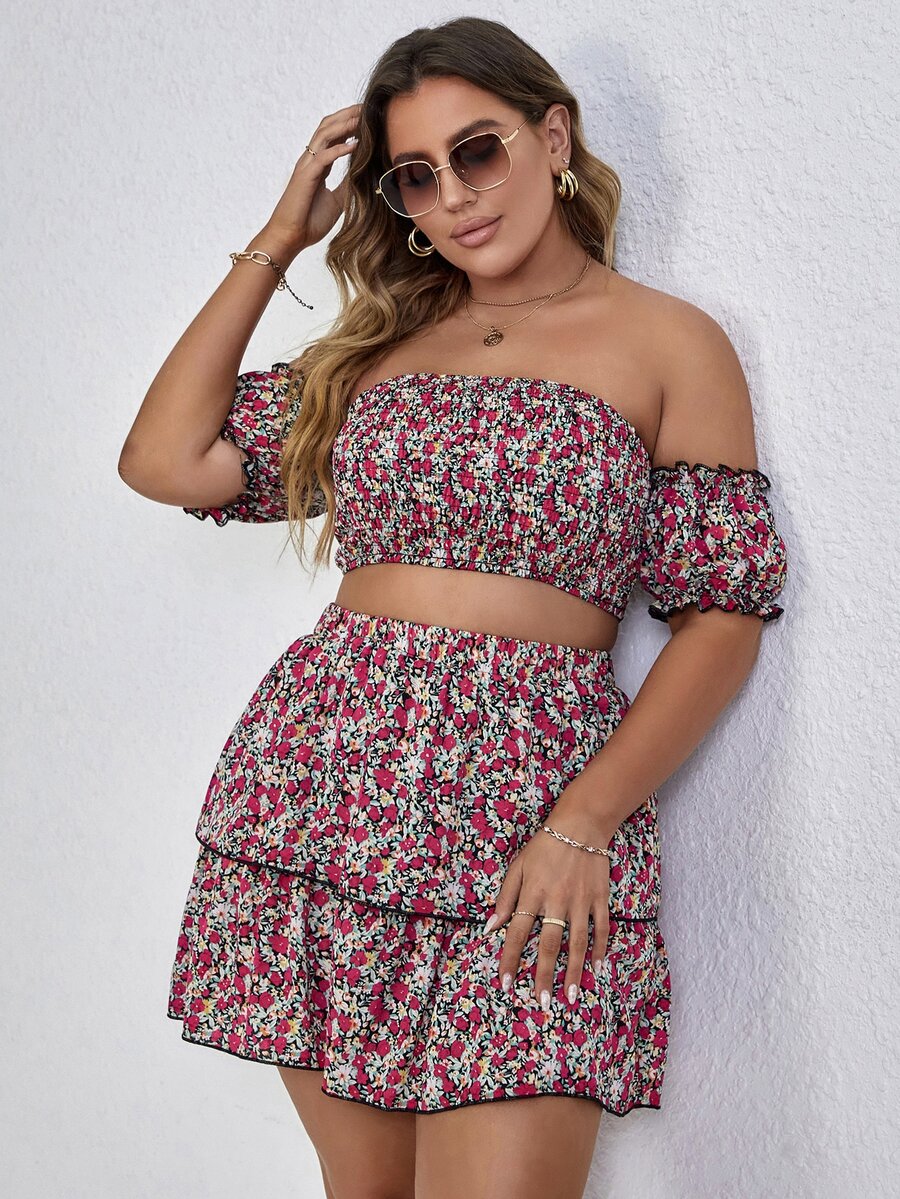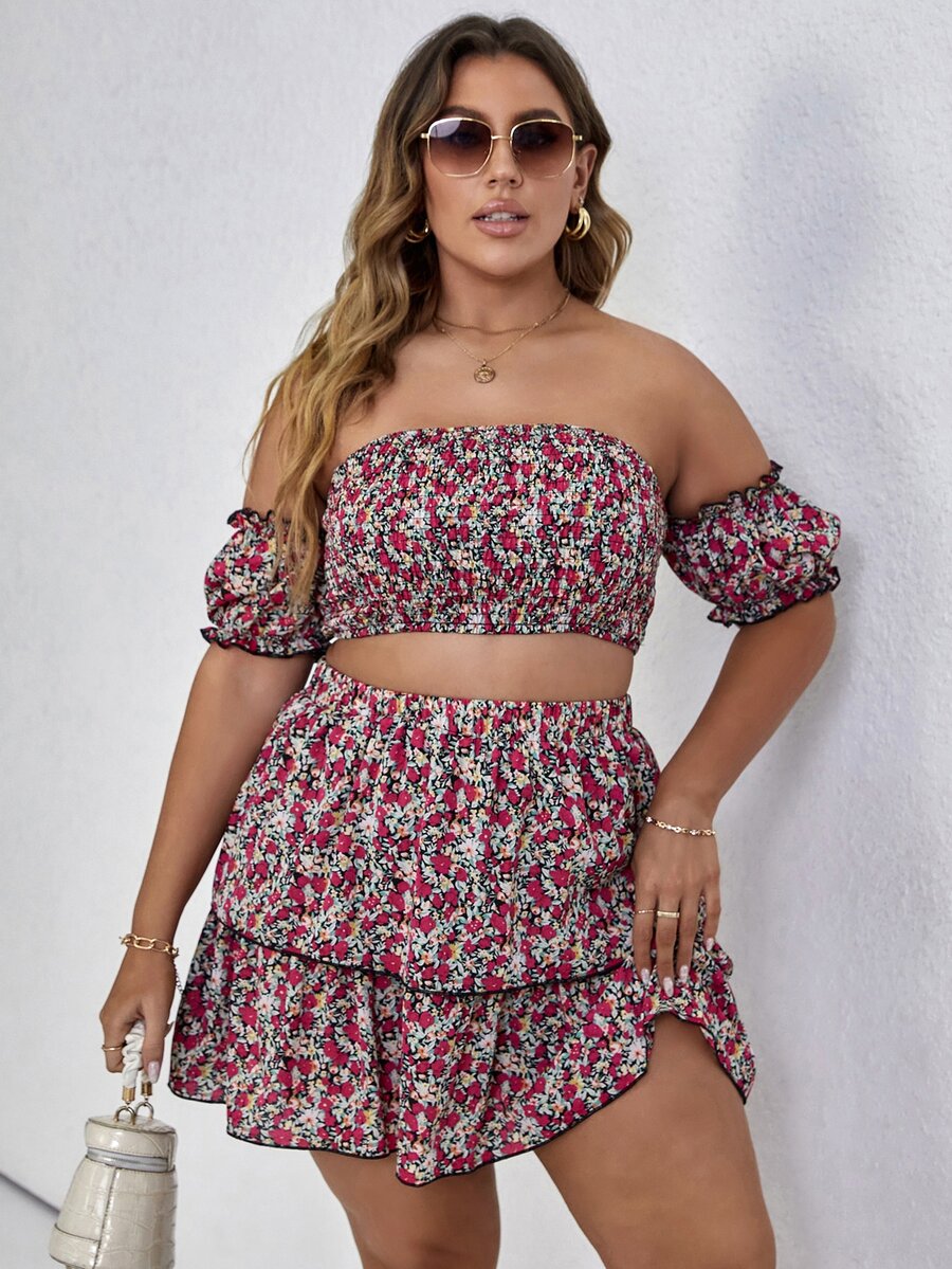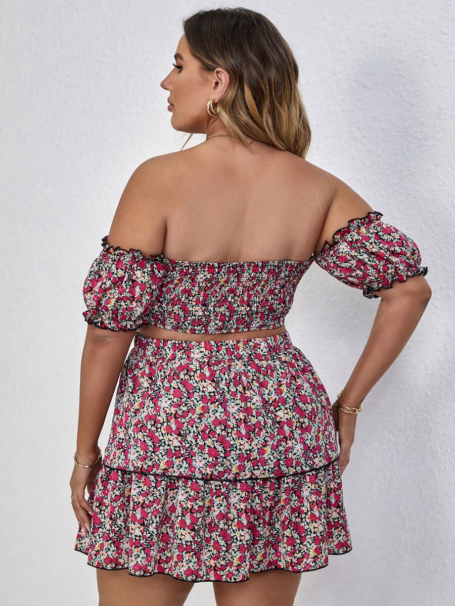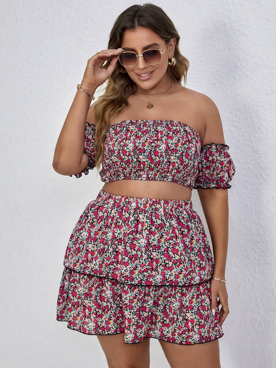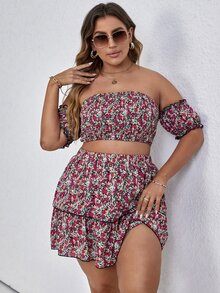 Plus Allover Floral Bardot Shirred Crop Top & Layered Skirt