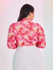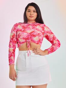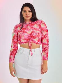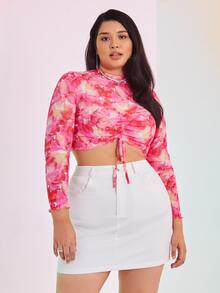 Plus Allover Print Drawstring Lettuce Trim Crop Mesh Tee