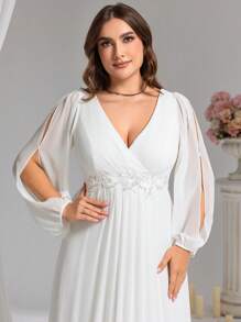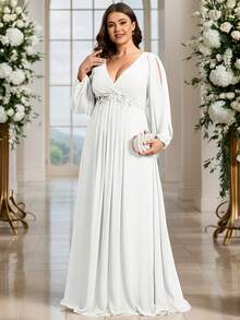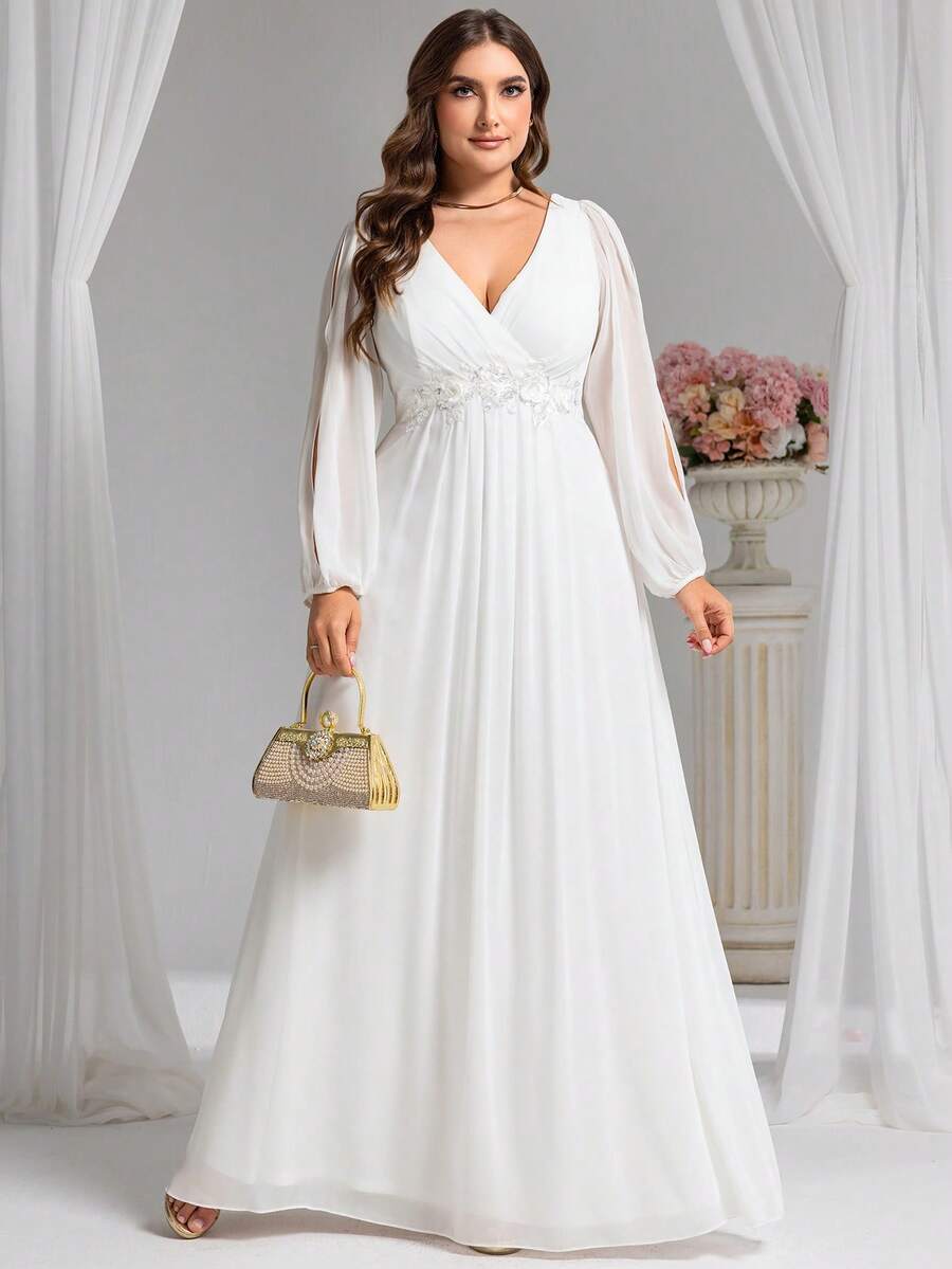 Plus Appliques Zip Back Long Sleeve Bridal Shower Dress White Elegant Formal Evening Prom Wedding Guest Gown, For Graduation, Dinner
