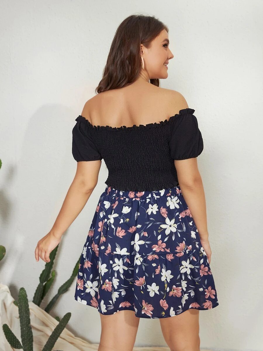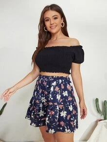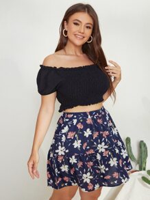 Plus Bardot Shirred Crop Top & Floral Skirt Set