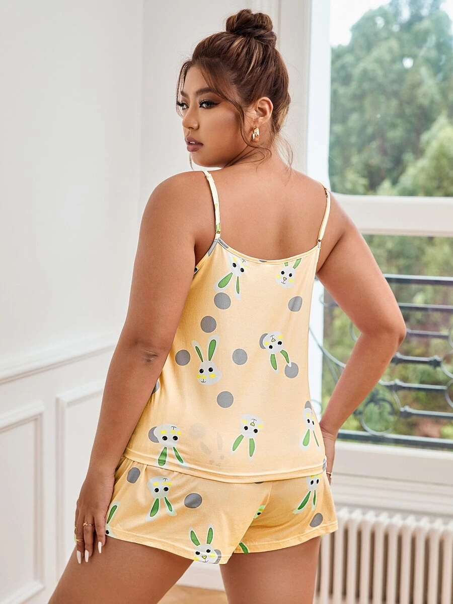 Plus Cartoon Rabbit & Polka Dot Cami & Shorts PJ Set & Eye Mask