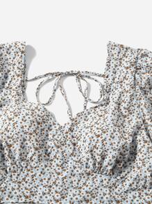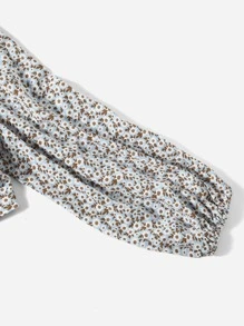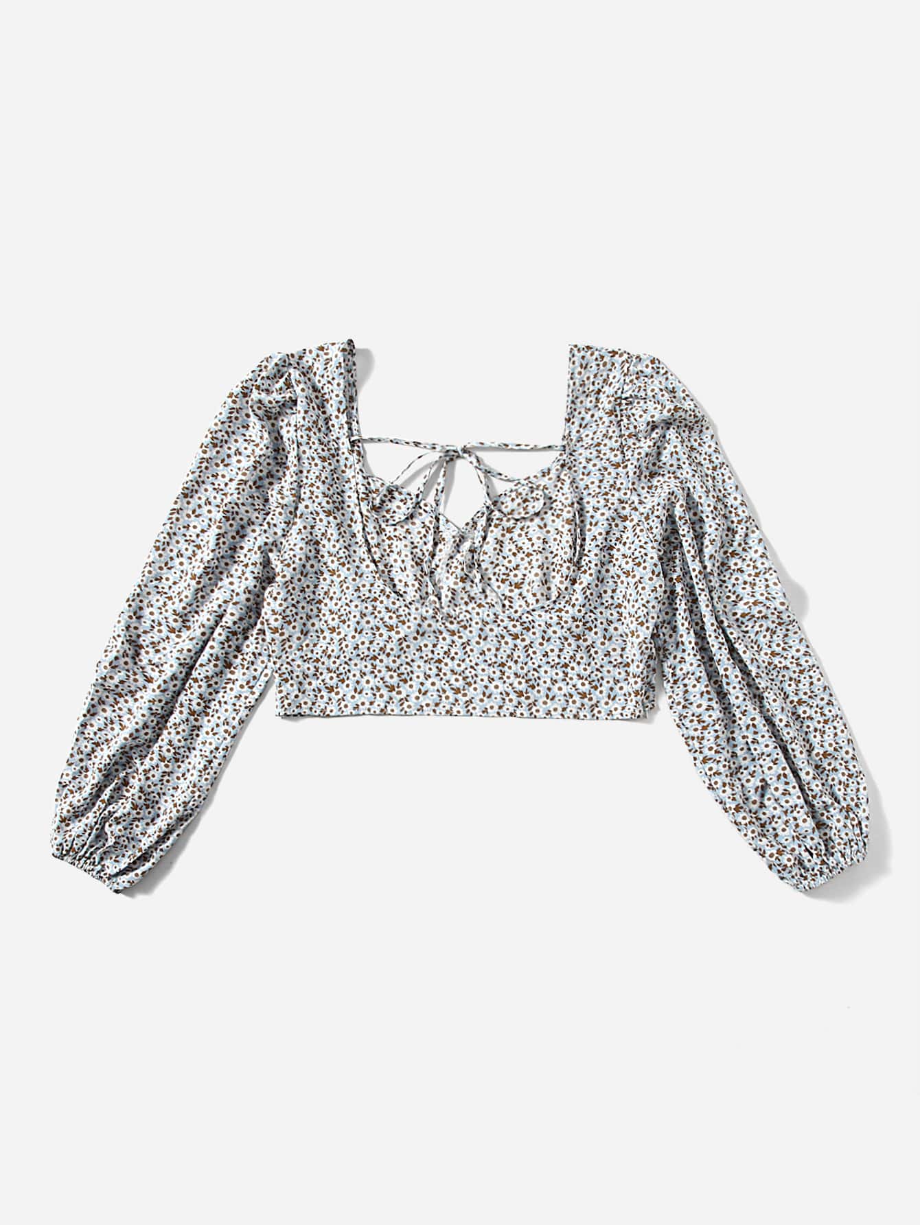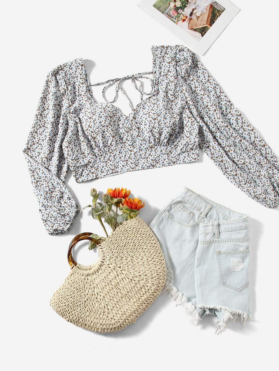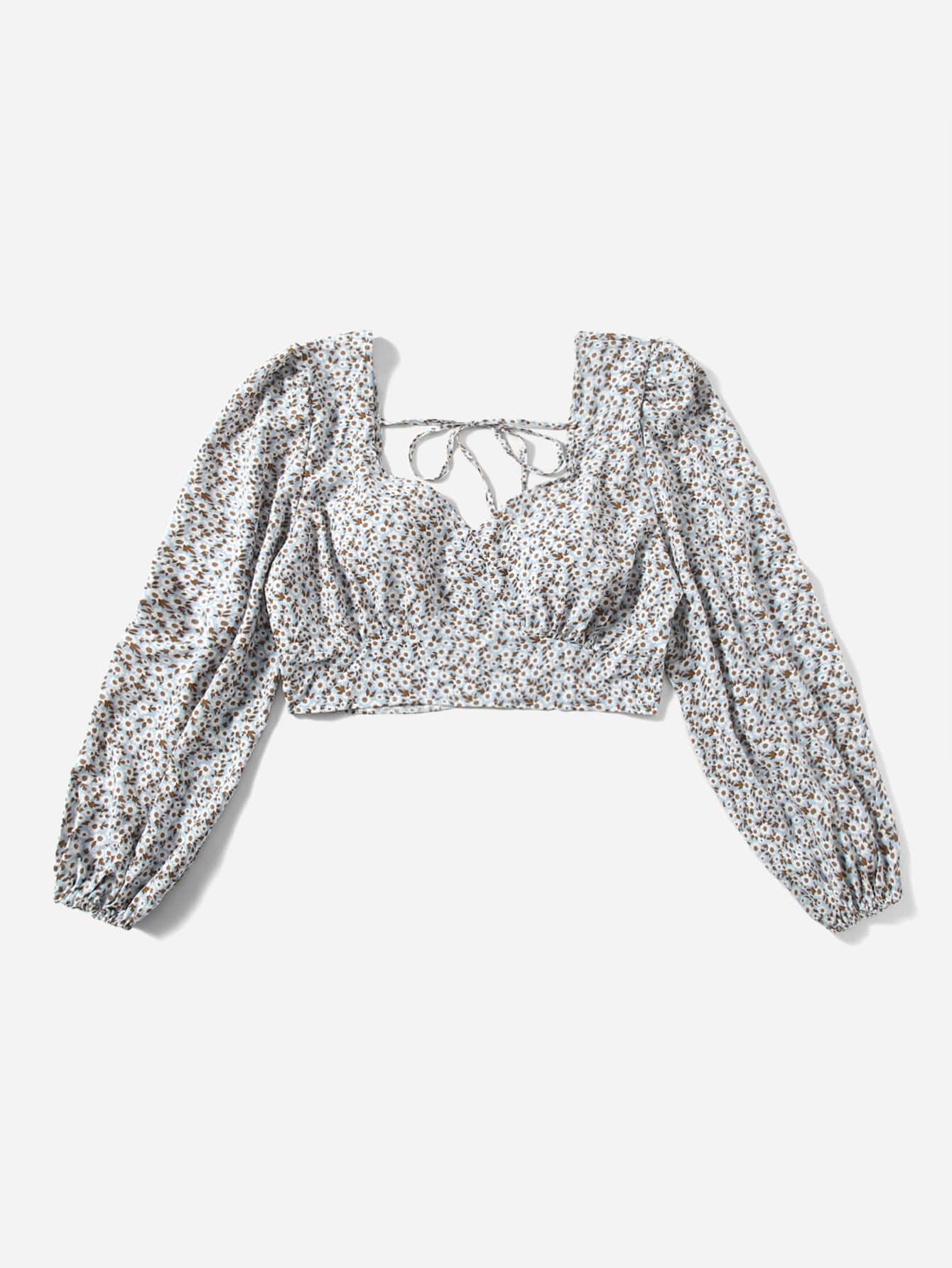 Plus Ditsy Floral Sweetheart Neck Tie Back Lantern Sleeve Blouse