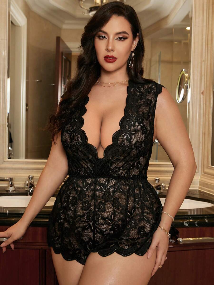 Plus Floral Lace Scallop Trim Romper Bodysuit