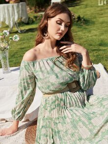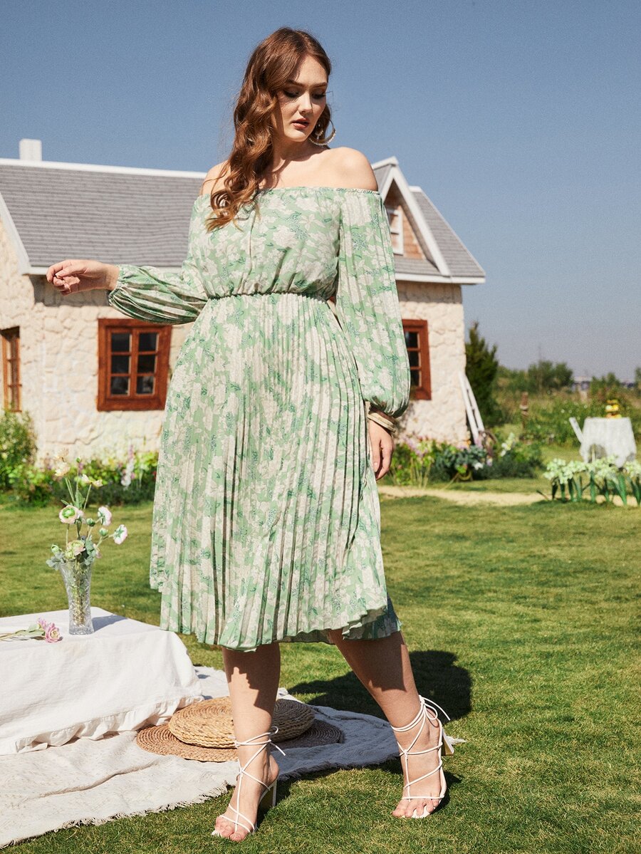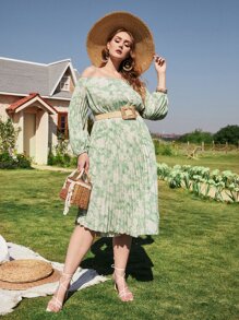 Plus Floral Print Pleated Lantern Sleeve Dress Without Belt
