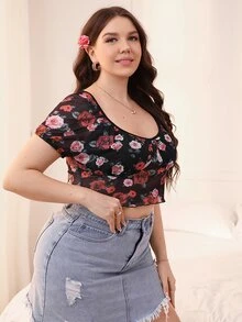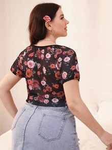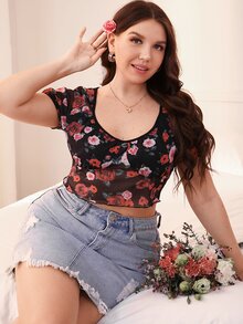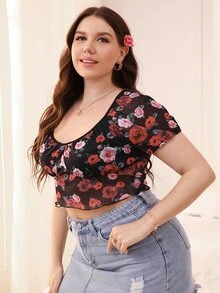 Plus Floral Print Scoop Neck Bustier Crop Mesh Top