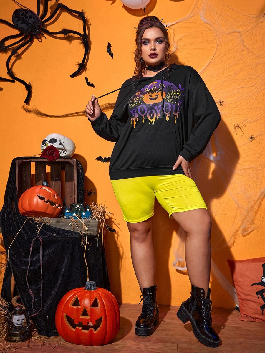 Plus Halloween Cat And Pumpkin Print Drop Shoulder Drawstring Hoodie