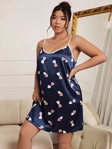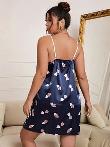 Plus Heart Print Contrast Binding Satin Cami Nightdress