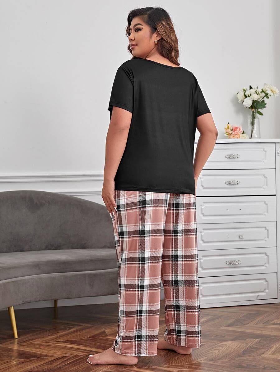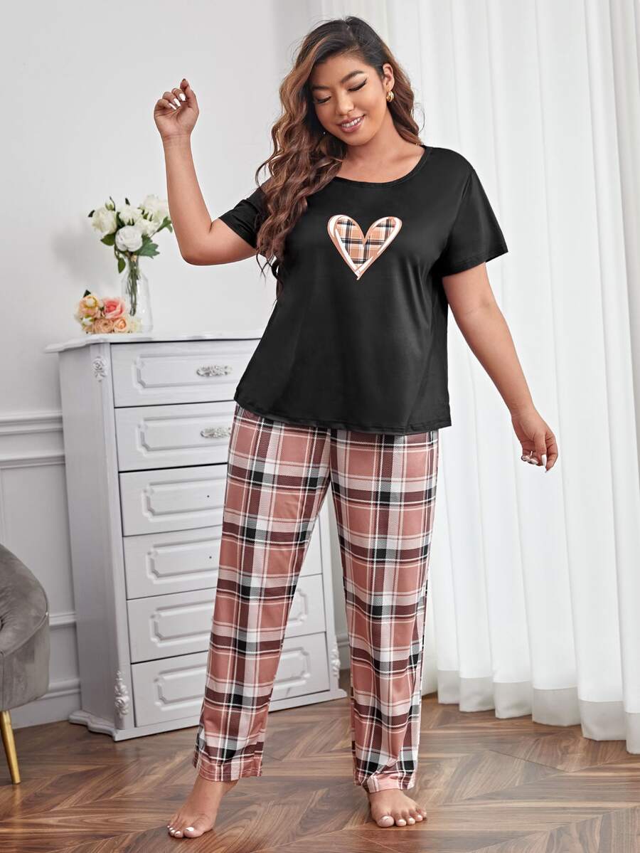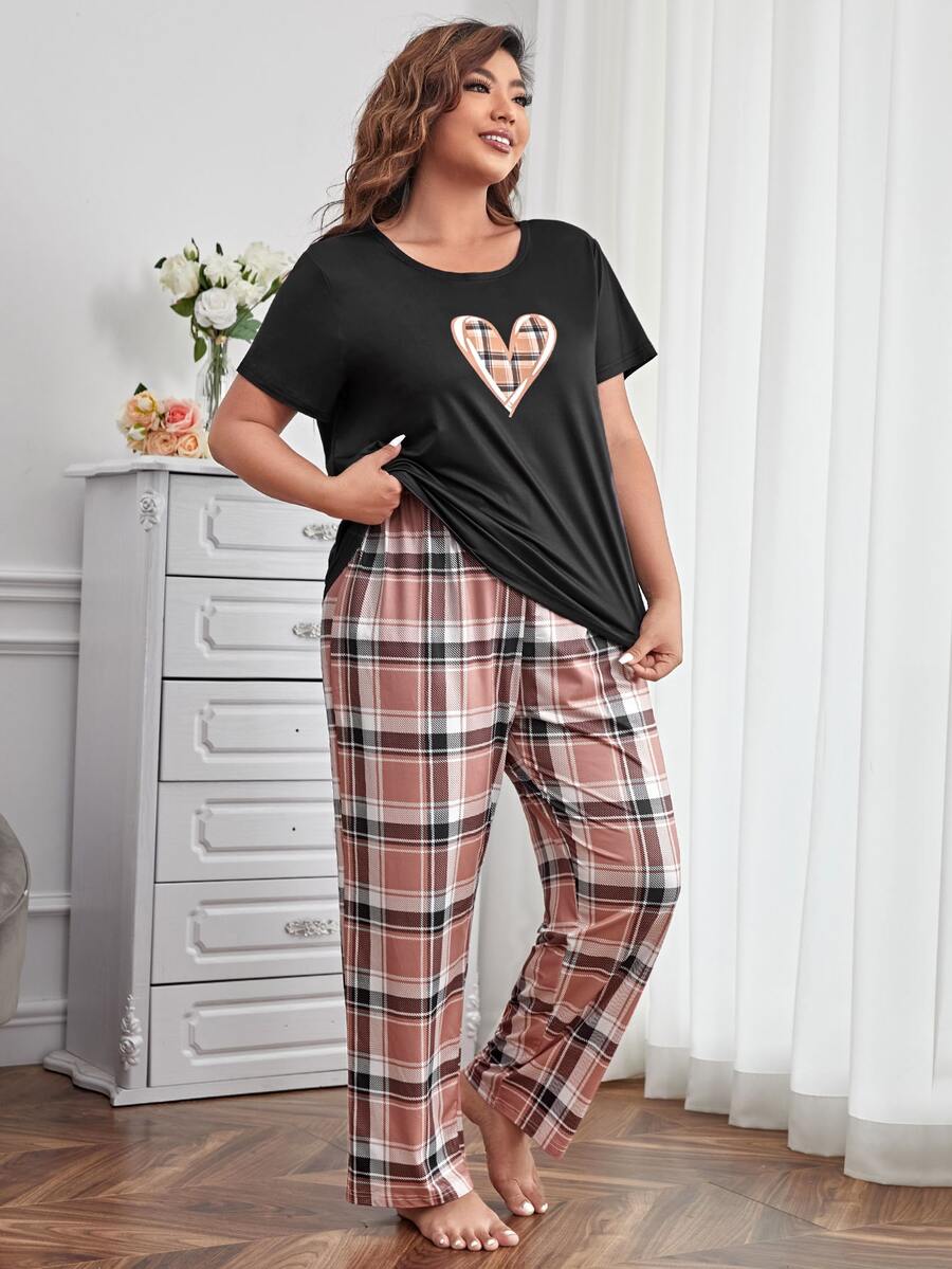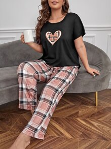 Plus Heart Print Tee & Plaid Print Pants PJ Set