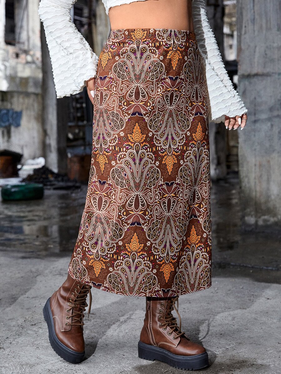 Plus High Waist Damask Print Skirt Without Belt