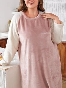 Plus Letter Embroidery Raglan Sleeve Colorblock Flannel Nightdress