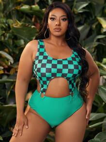 Plus Plaid Cut Out Ring Linked One Piece Swimsuit
