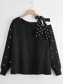 Plus Polka Dot Asymmetrical Neck Tie Shoulder Sweatshirt