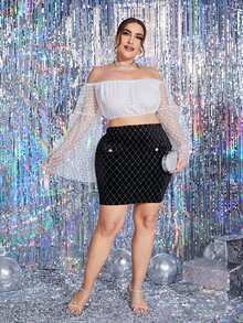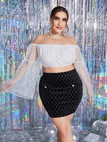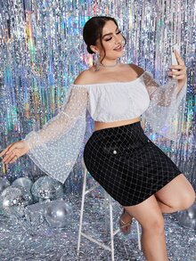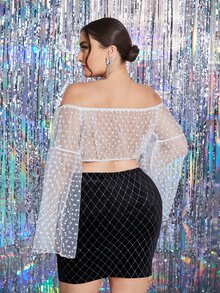 Plus Polka Dot Off Shoulder Trumpet Sleeve Mesh Top