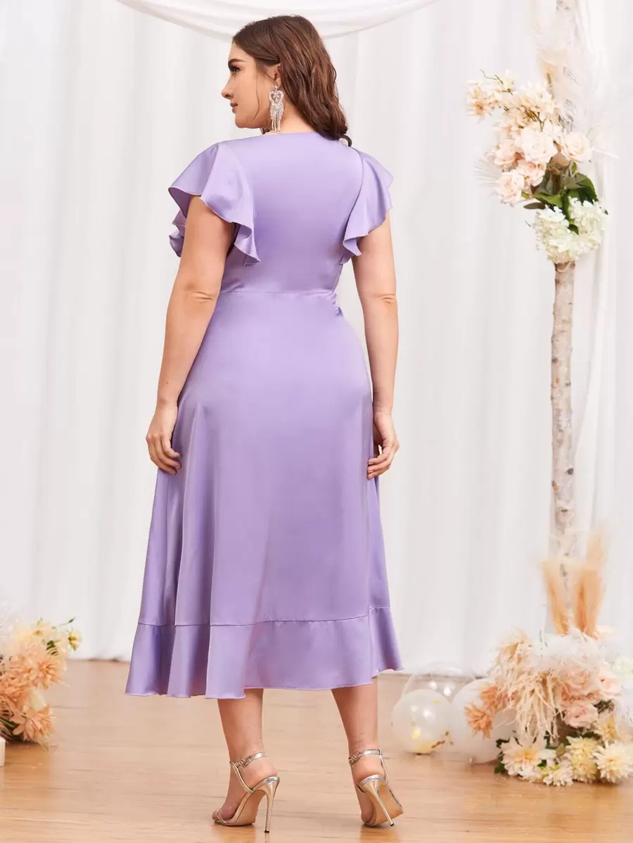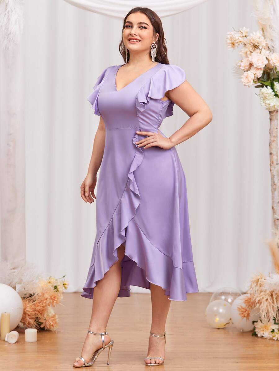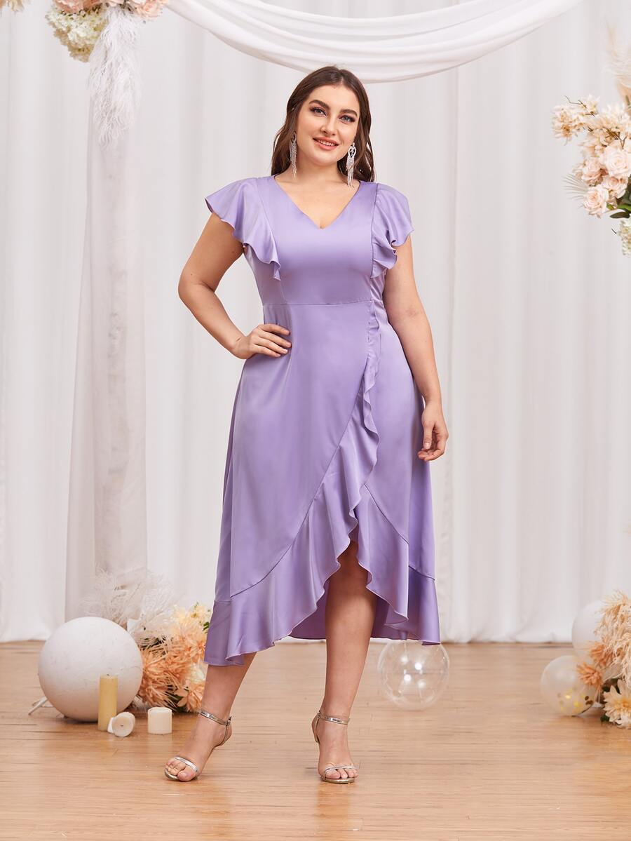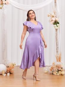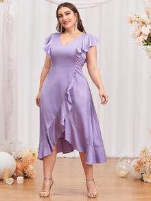 Plus Ruffle Trim Asymmetrical Hem Satin Dress