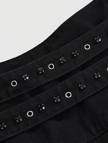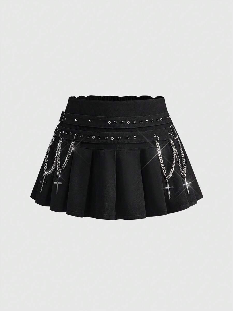 Plus Size Black Denim Metal Chain Cross Pendant Double Waist Belt Skirt Plus Size Black Denim Skirt Gothic Casual Punk Style Women Plus Size Skirt