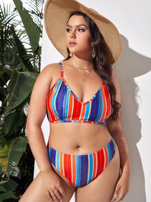 Plus Size Colorful Stripe High Waisted Bikini Set Summer Beach