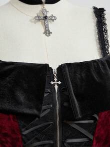 Goth Plus Size Gothic Elegant Luxurious Off-Shoulder Strap Lace Flare Sleeve Tie-Up Splice Contrast Color Blouse, Autumn/Winter Plus Size Gothic Luxurious Retro Women Top