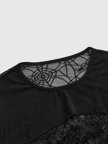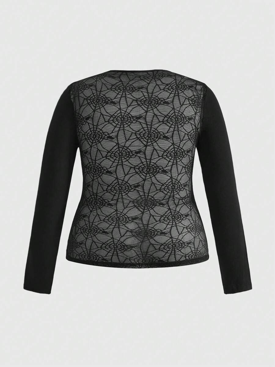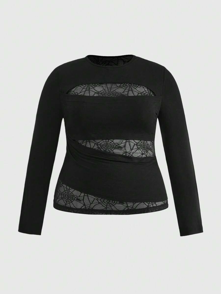 Goth Plus Size Gothic Sexy Spider Web Patchwork Hollow Out Back Long Sleeve T-Shirt, Autumn/Winter