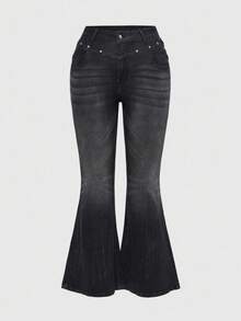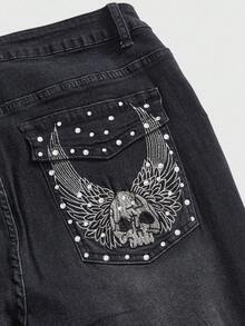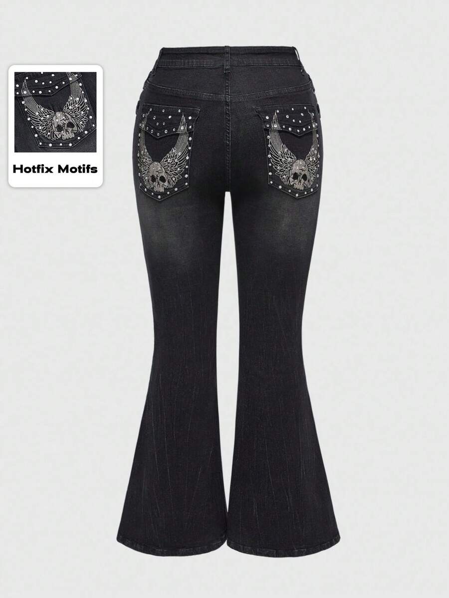 Goth Plus Size Gothic Skeleton Wing Rhinestone Embroidery Women's Flare Jeans, Plus Size Autumn/Winter Women Denim Pants, Plus Size Gothic Fashion Embroidered Pocket Women Flare Jeans