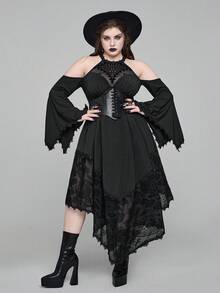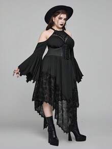 Goth Plus Size Gothic Style Asymmetrical Hem Lace Collar Floral Print Flare Sleeve Maxi Dress, Autumn/Winter Plus Size Gothic Dark Elegant Long Dress, Gothic Luxurious Vintage Plus Size Women Long Dress For Halloween, Christmas Party