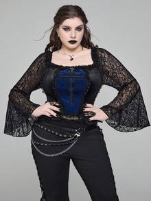 EDITION Plus Size Gothic Style Dark Blue Lace Cross Women's Top, Autumn/Winter. Dark Gothic Velvet Patchwork Bright Blue Cross Lace Velvet Shirt, Plus Size Women Tops, Suitable For Halloween Party, Dinner, Banquet, Vintage Palace Style Gothic Plus Size Women Blouse Shirt