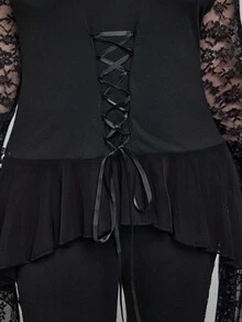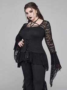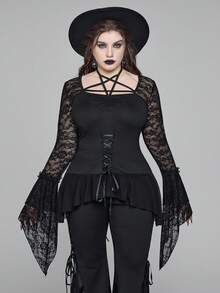 Goth Plus Size Gothic Style Lace Patchwork Asymmetric Flare Sleeve Waist Tie Five-Pointed Star Halter Neck Blouse, Plus Size Gothic Style Elegant Dark Aesthetic Women Top, Plus Size Sexy Top, Gothic Style Plus Size Women Clothing