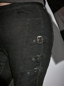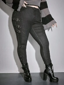 Goth Plus Size Grunge-Punk Street Fashion Vintage Distressed Side Tie Denim Jeans, Autumn/Winter Women Bottoms Plus Size Jeans