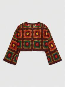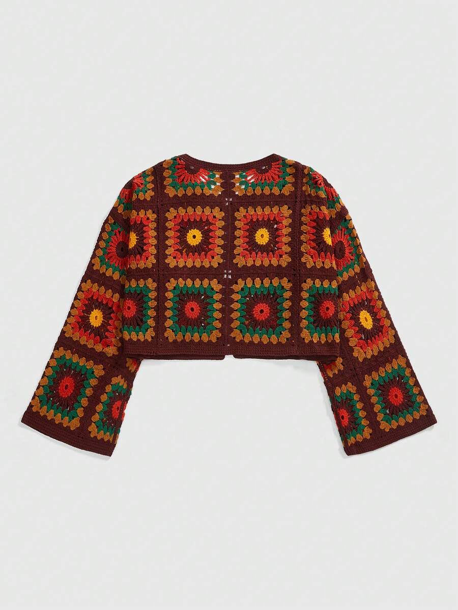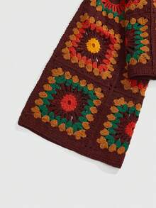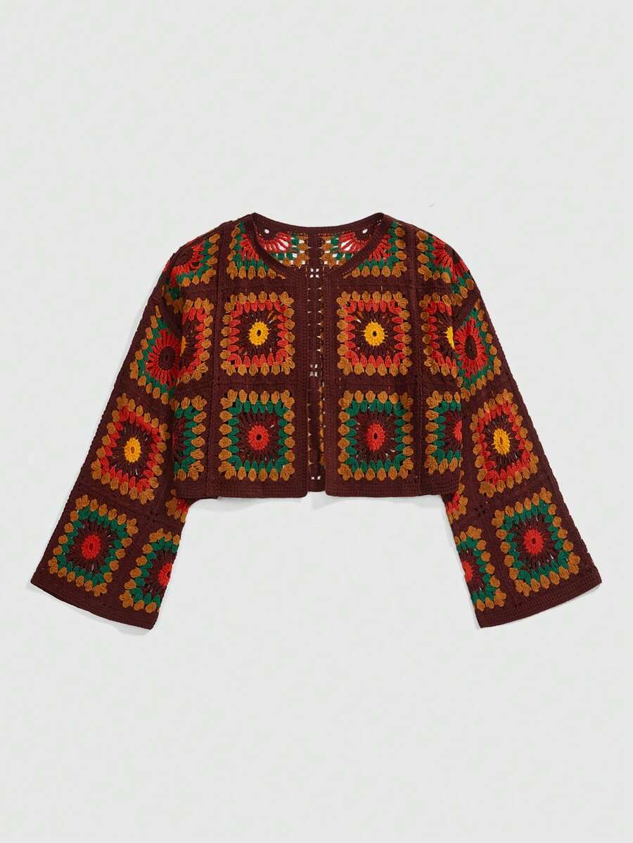 Fairycore Plus Size Retro Brown Crochet Floral Pattern Knit Cardigan, Vintage Brown Aesthetic Openwork Knit Sweater Jacket For Women, Plus Size Casual Autumn/Winter Hippie Retro Aesthetic Knit Cardigan