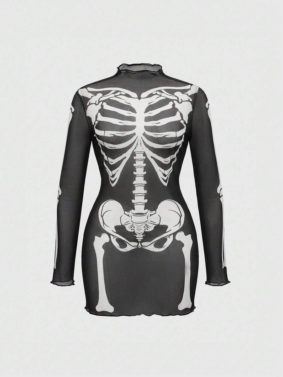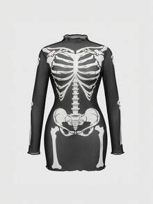 Goth Plus Size Skeleton Print Fashion Long Sleeve Dress