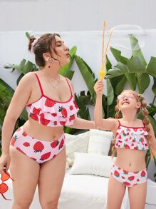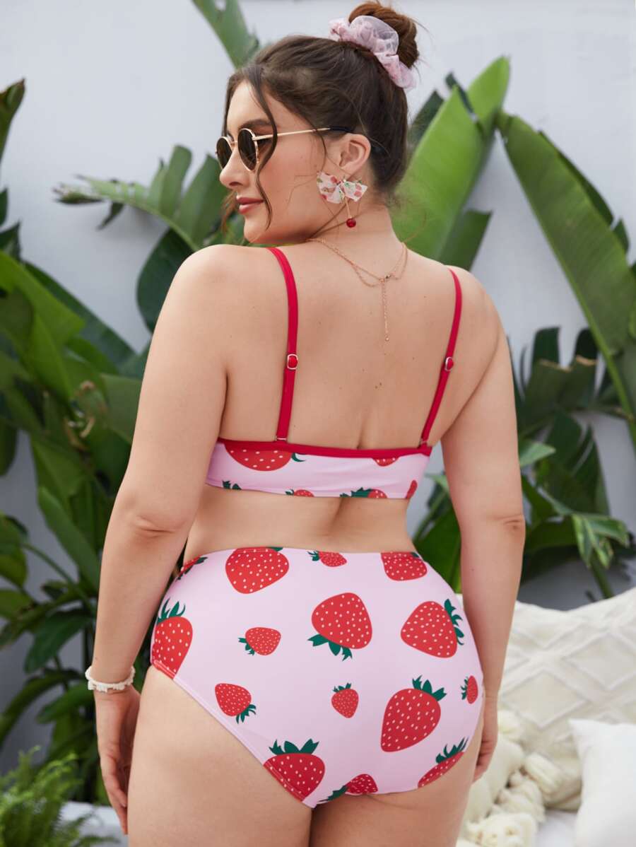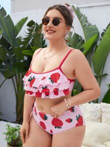 Plus Size Strawberry Print Tiered Layer Bikini Set Summer Beach