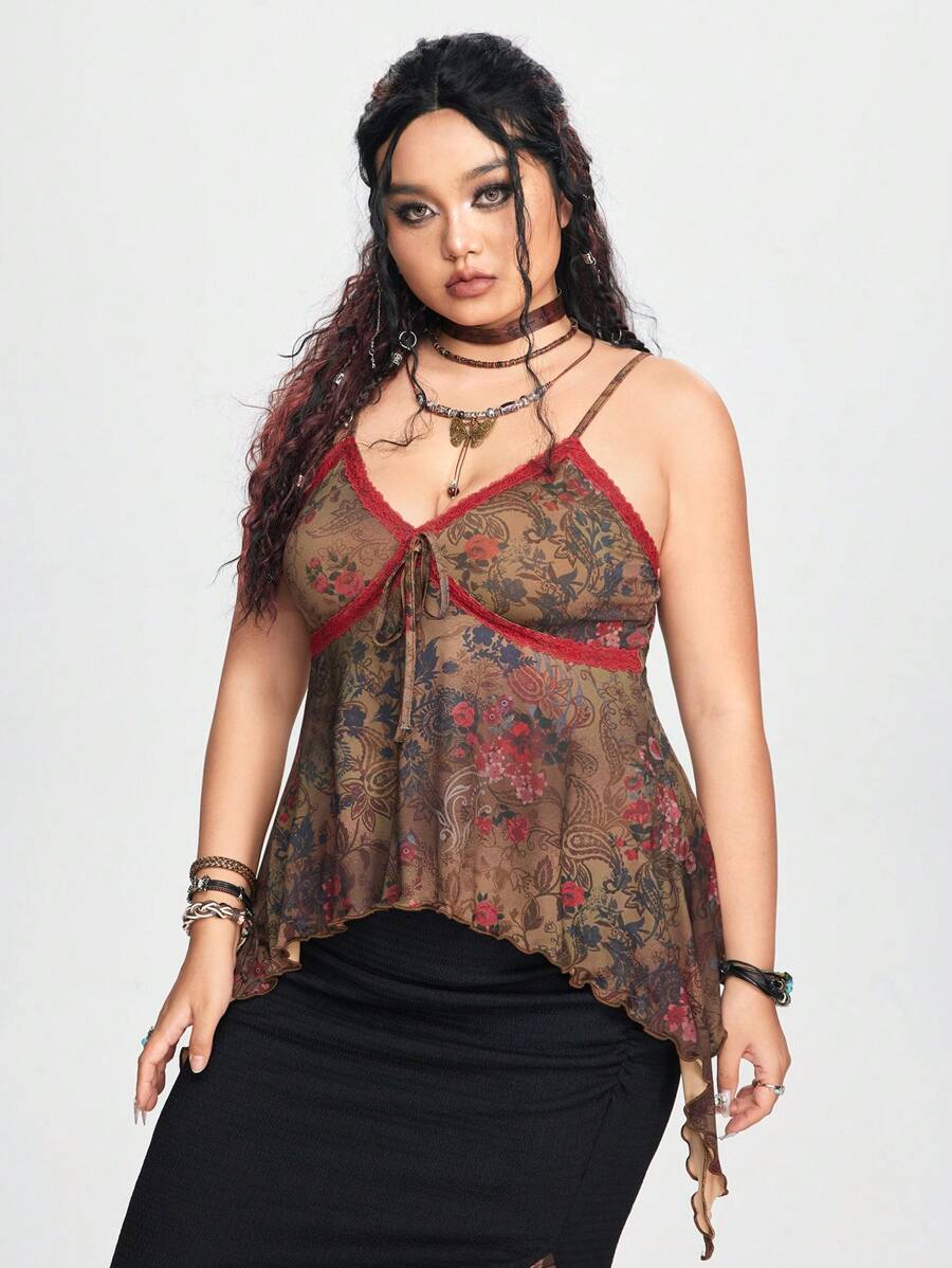 Plus Size Summer Vintage Flower Printed Cami Top With Lace Trim, School