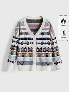 ROMWE Avant Plus Size Vintage Color Geometric Striped Pattern Knit Cardigan, Autumn/Winter Plus Size Holiday Christmas Retro Sweater Top, Plus Size Women Knit Cardigan