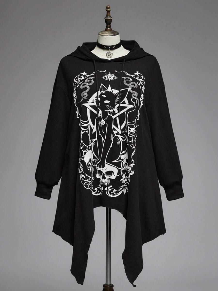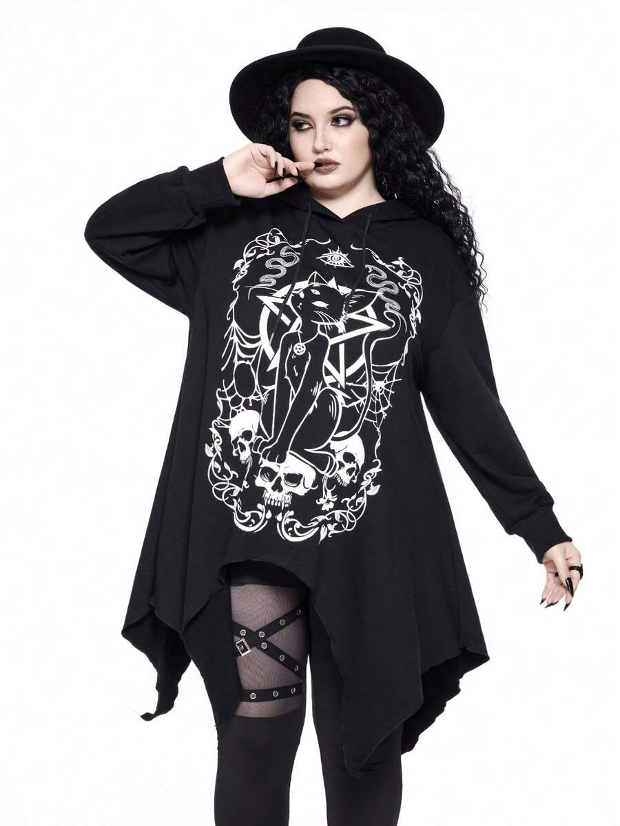 Plus Size Vintage Dark Gothic Mysterious Black Cat Astrology Graphic Hooded Asymmetrical Hem Sweatshirt/Winter