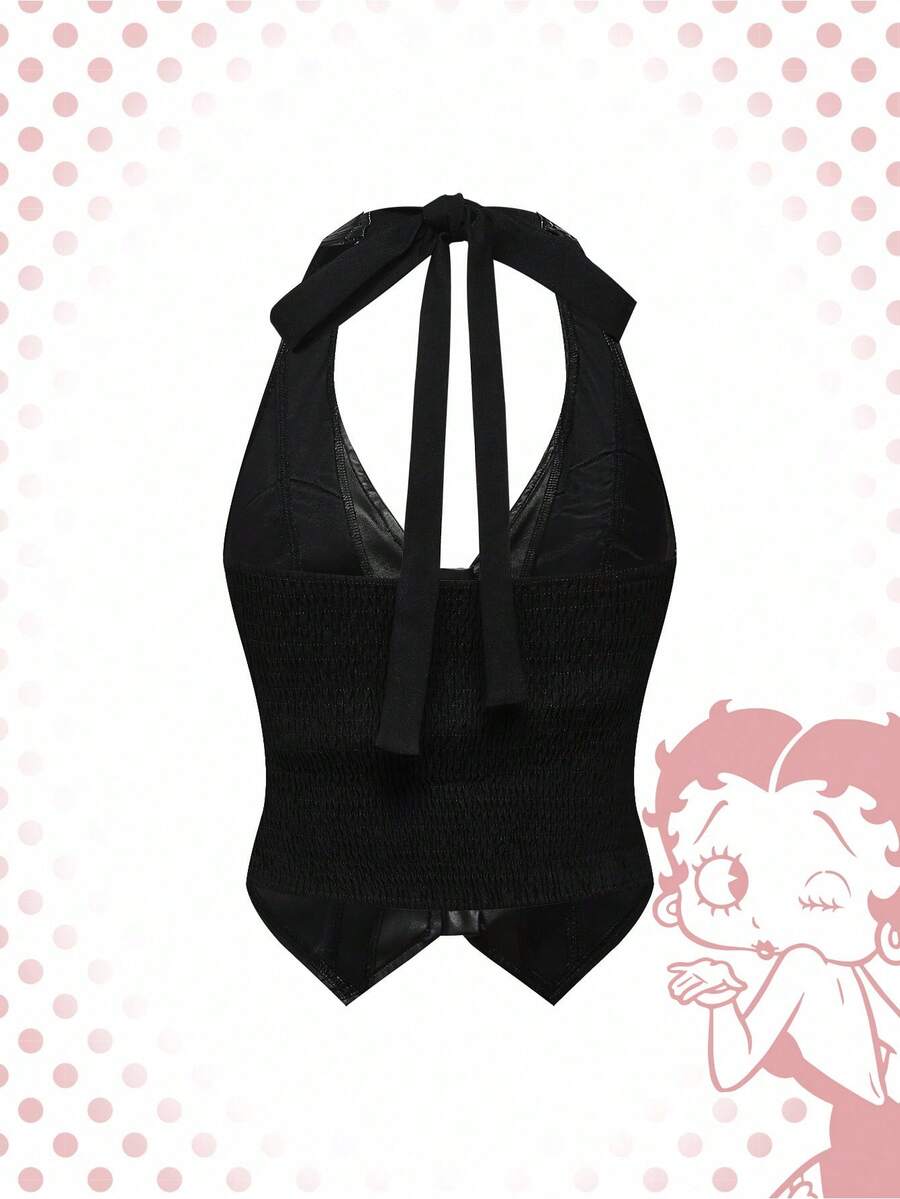 Betty Boop | ROMWE Plus Size Women's Motorcycle Betty Sexy Embroidered Zipper PU Leather Halter Top