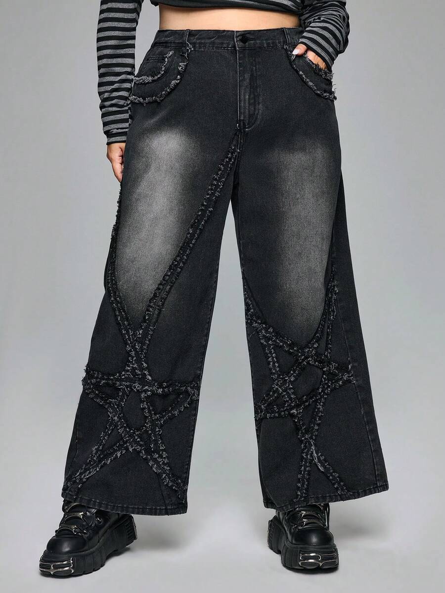 Goth Plus Size Women Casual Grunge-Punk Distressed Five-Pointed Star Washed Loose Straight Leg Jeans, Vintage Wash Denim Pants For Autumn/Winter