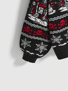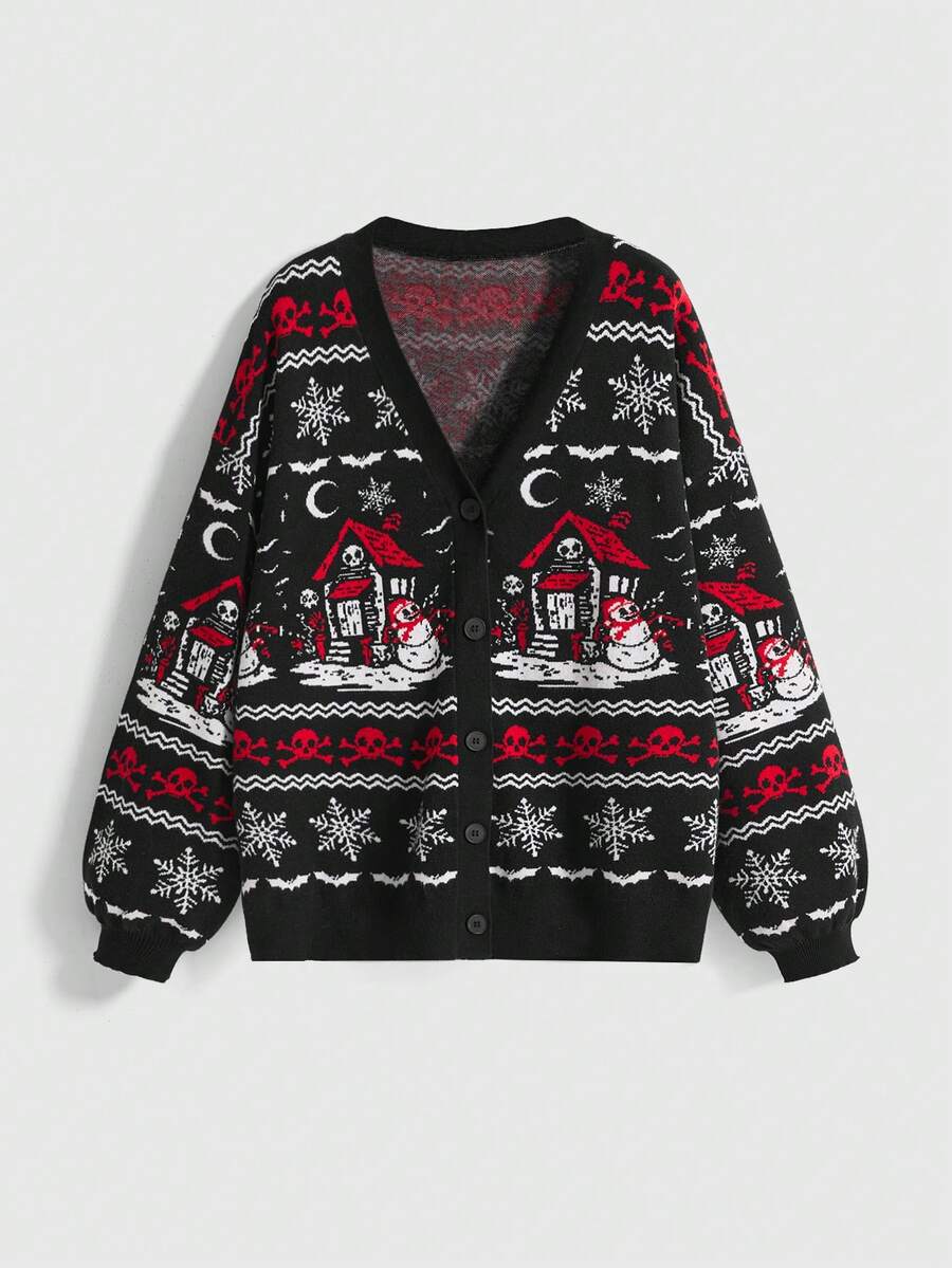 Goth Plus Size Women Gothic Christmas Snowflake Skull Moon Snow House Pattern Jacquard Knit Cardigan, Autumn/Winter