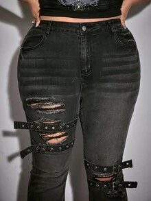 Goth Plus Size Women Gothic Style Distressed Asymmetrical Ripped Jeans, Plus Size Women Gothic Lace-Up Flare Jeans, Plus Size Women Street Style Denim Bottoms For Autumn