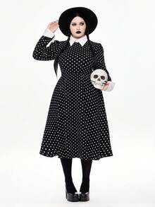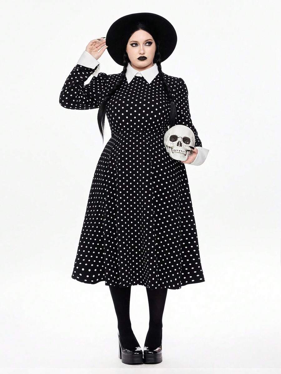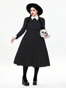 ROMWE Avant Plus Size Women Polka Dot Pattern Cosplay Role-Playing Mid-Length Dress, Slimming