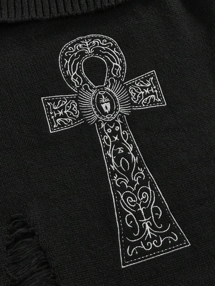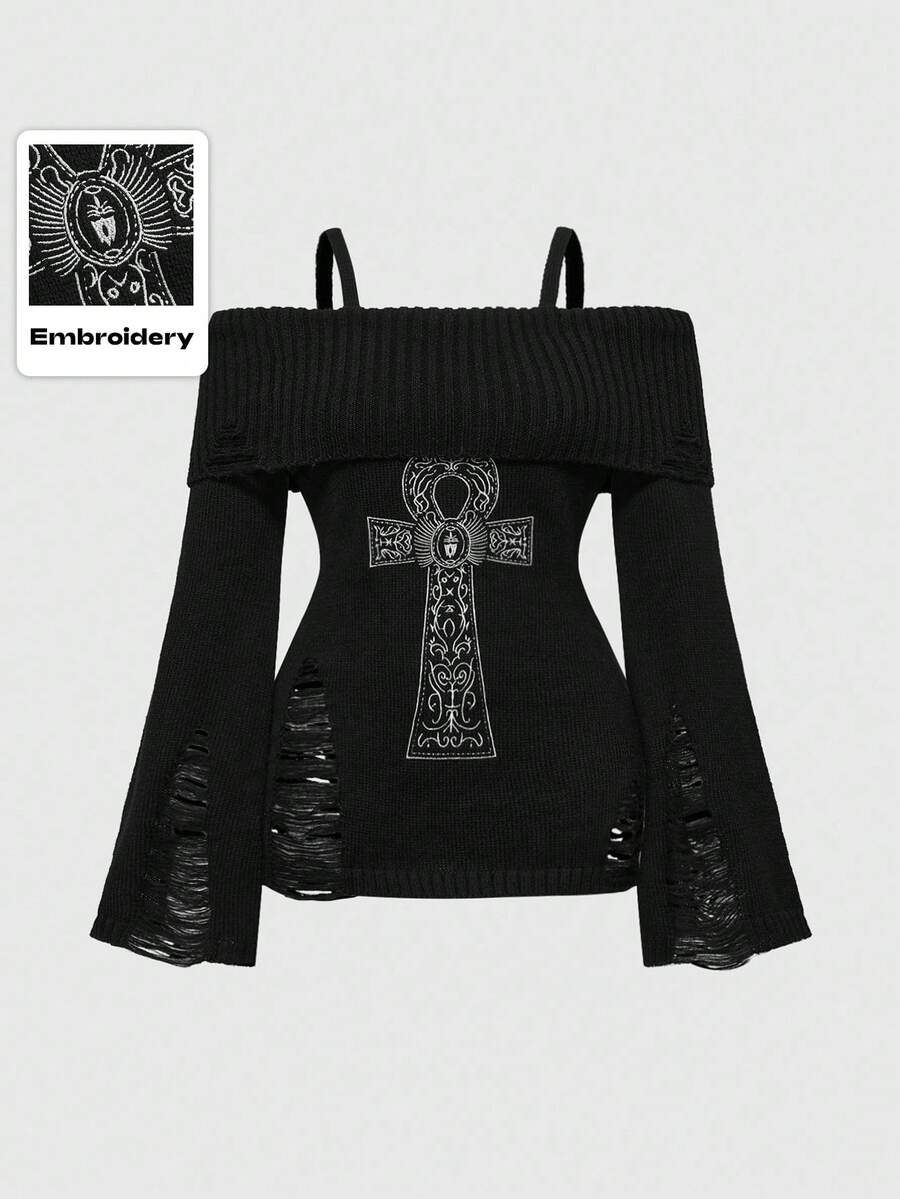 Goth Plus Size Women Punk Distressed Ankh Cross Embroidery Off Shoulder Fitted Sweater