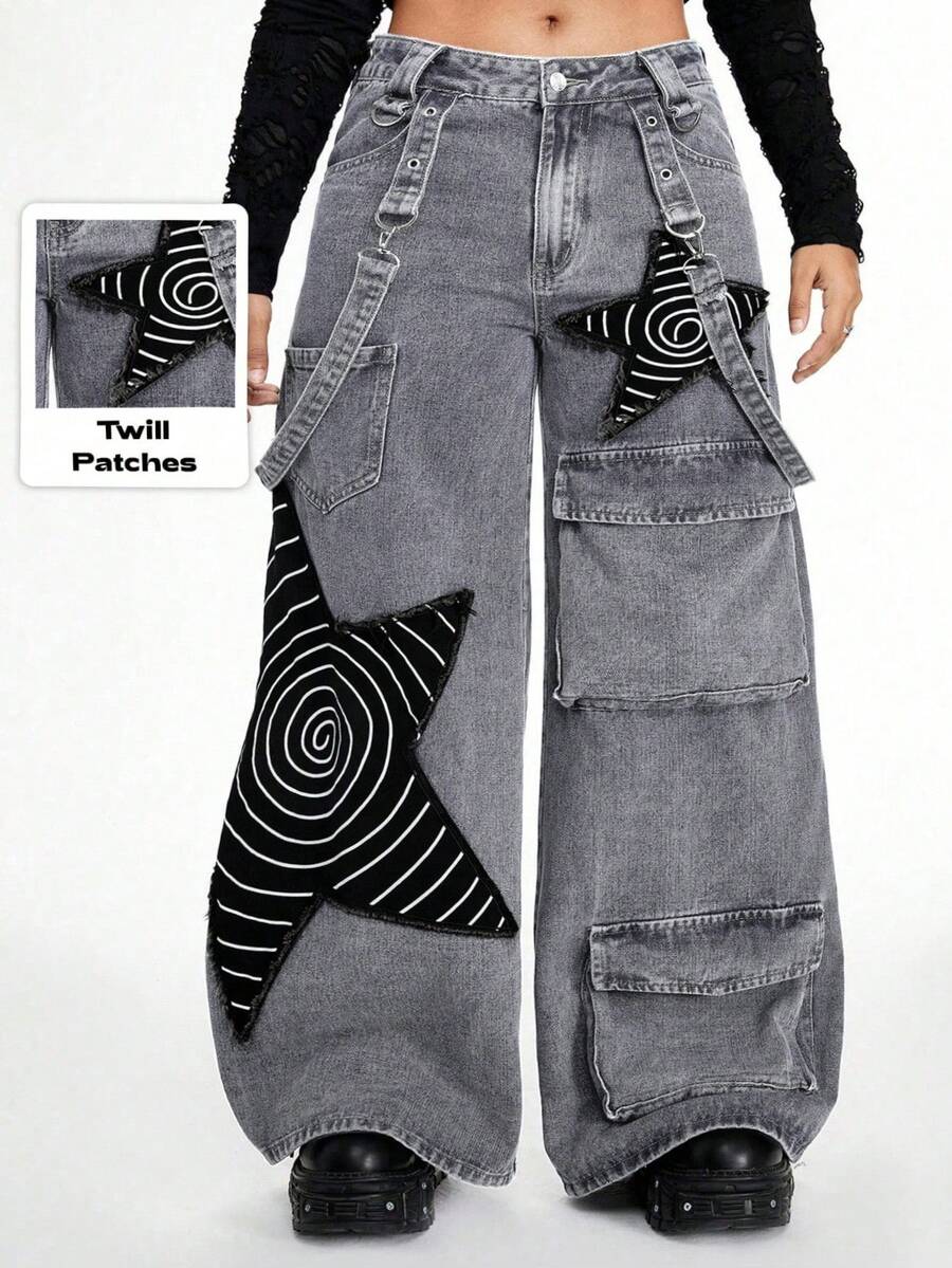 Grunge Punk Plus Size Women Punk Distressed Washed Star Patch Loose Cargo Wide Leg Pants