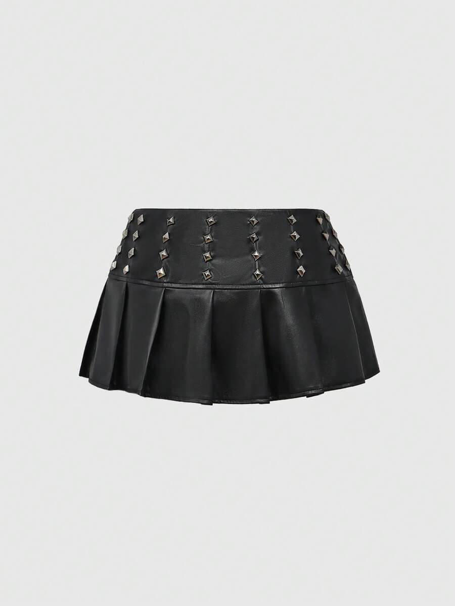 ROMWE Avant Plus Size Women Kpop Punk Rivet Pleated Decor PU Leather Mini Skirt, Punk PU Short Hem Mini Skirt, Black PU Mini Skirt