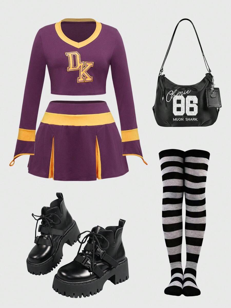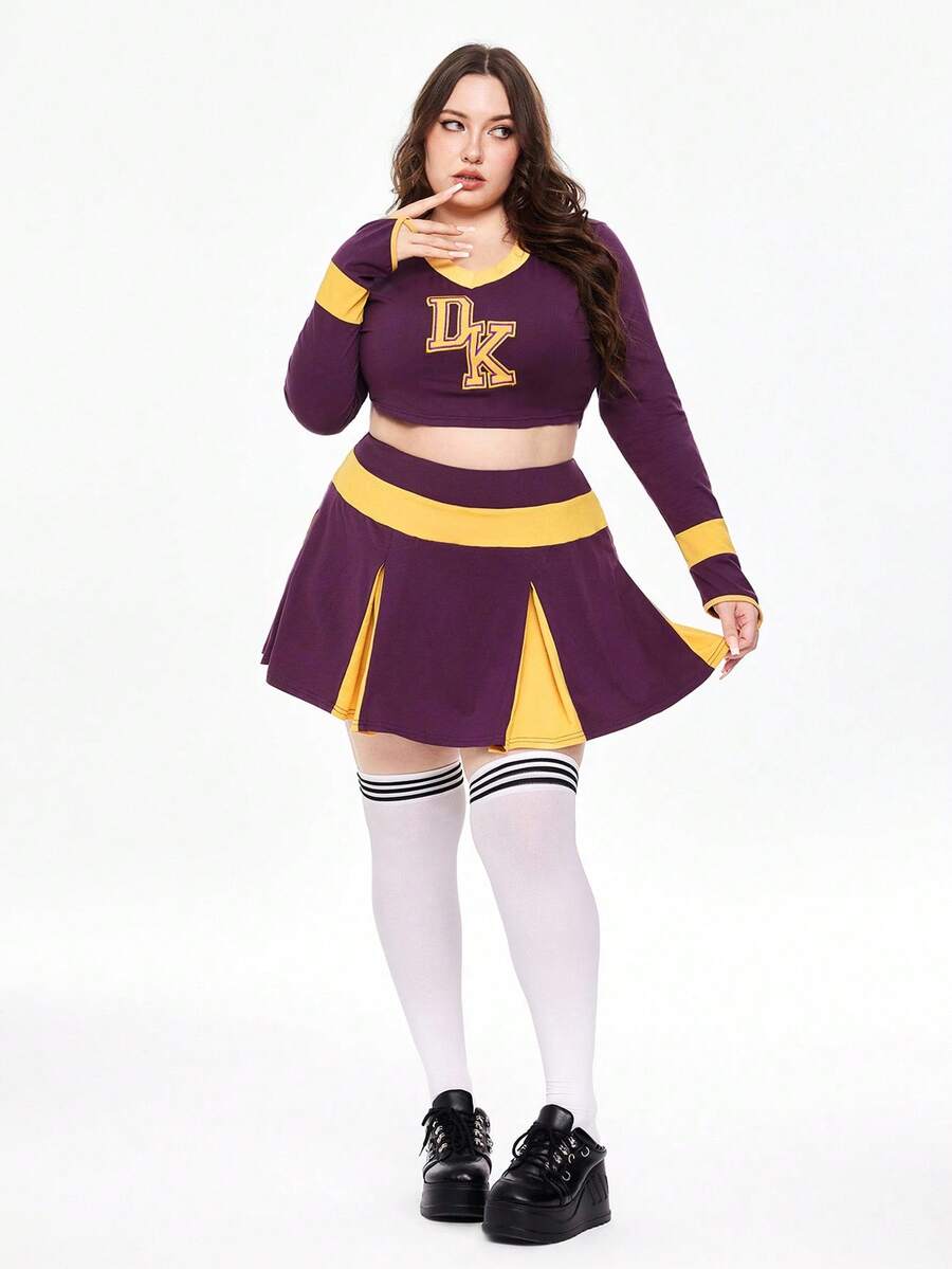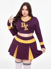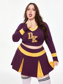 ROMWE Avant Plus Size Women Vintage Cheerleader Costume Long Sleeve Top And Mini Skirt Set, Cosplay