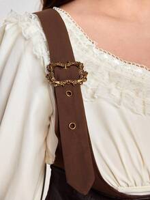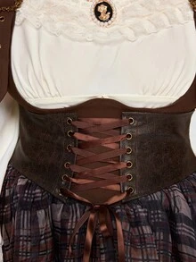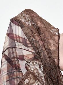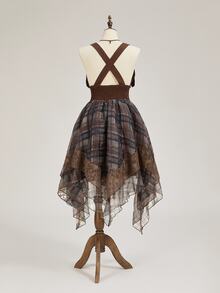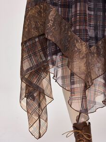 EDITION Plus Size Women Vintage Palace Romantic Classical PU Contrast Mesh Plaid Asymmetrical Hem Lace Trim Skirt