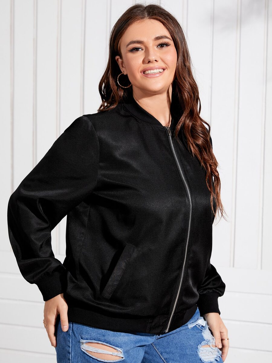 Plus Solid Zipper Front Bomber Jacket