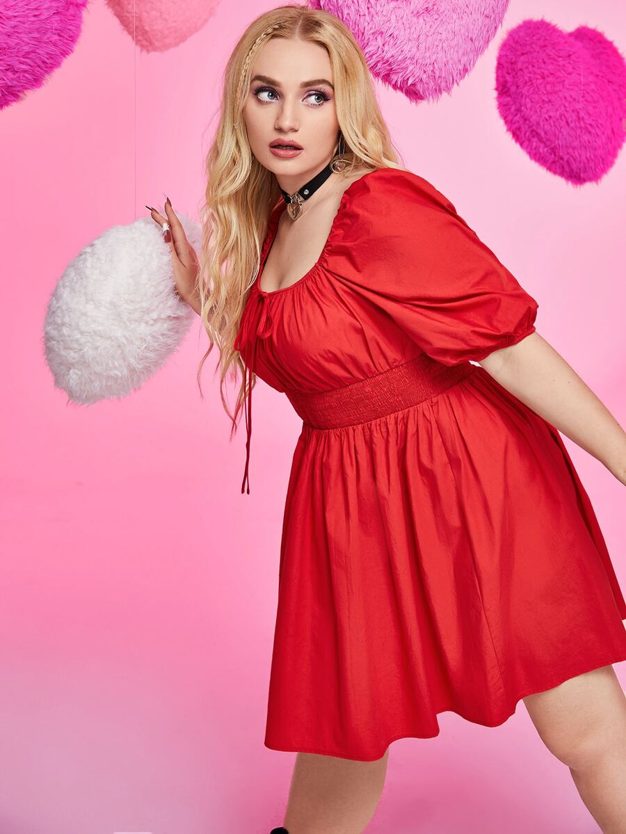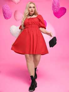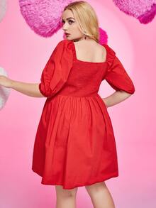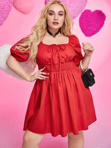 Plus Square Neck Tie Front Puff Sleeve Dress
