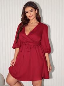 Plus Surplice Neck Lantern Sleeve Belted Dress