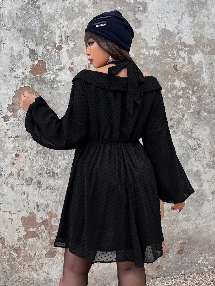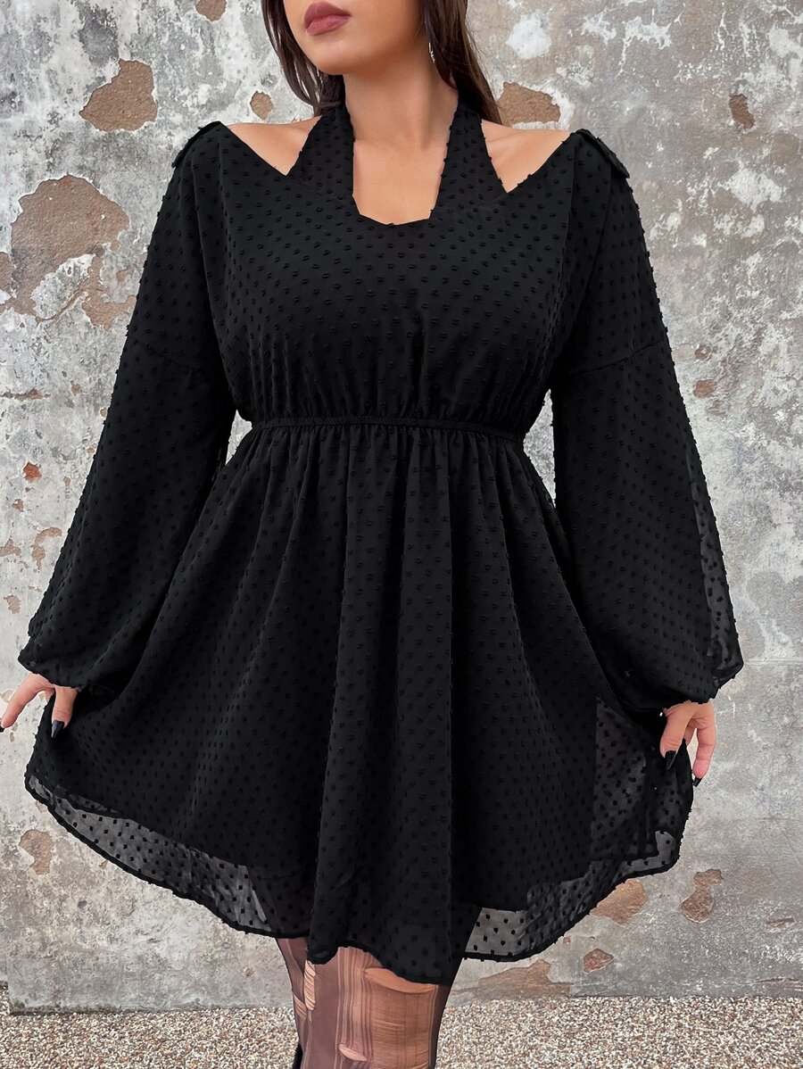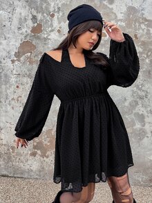 Plus Swiss Dot Halter Neck Lantern Sleeve Dress